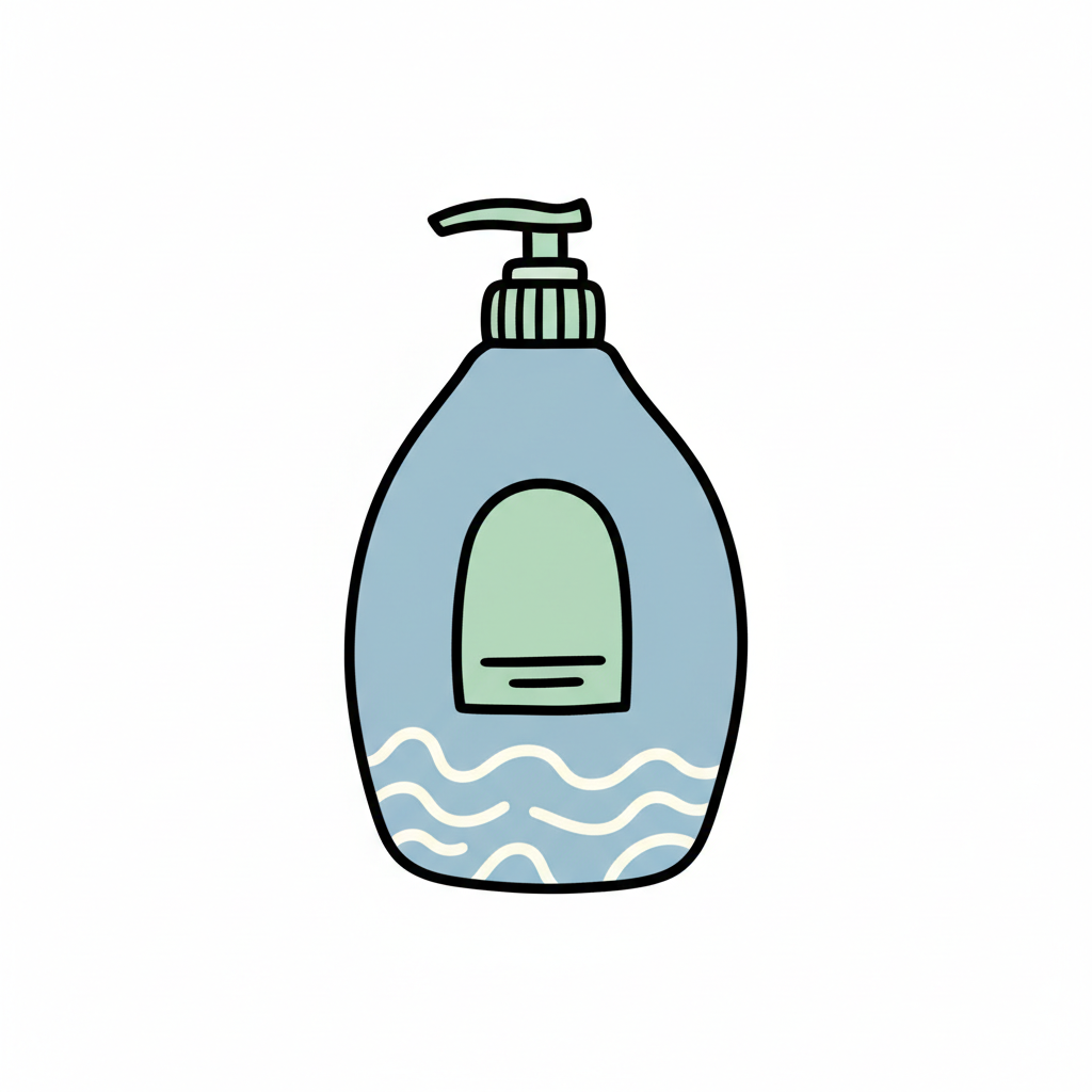 Illustration einer blauen Spenderflasche mit Wellen-Muster und grünem Pumpkopf.