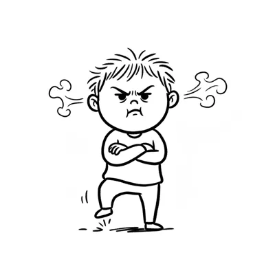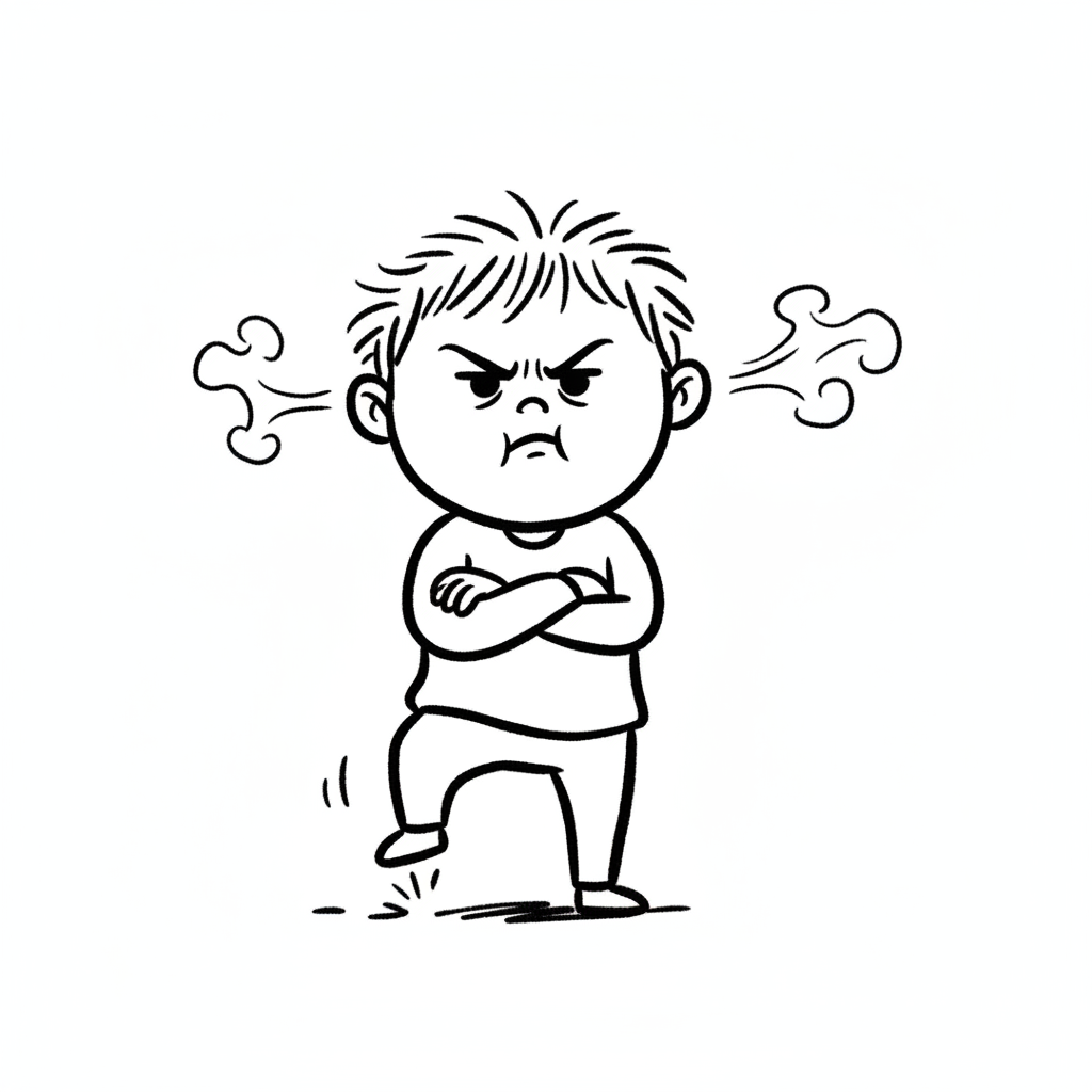 Wütendes Cartoon-Kind mit Dampf aus den Ohren, verschränkten Armen und stampfendem Fuß.