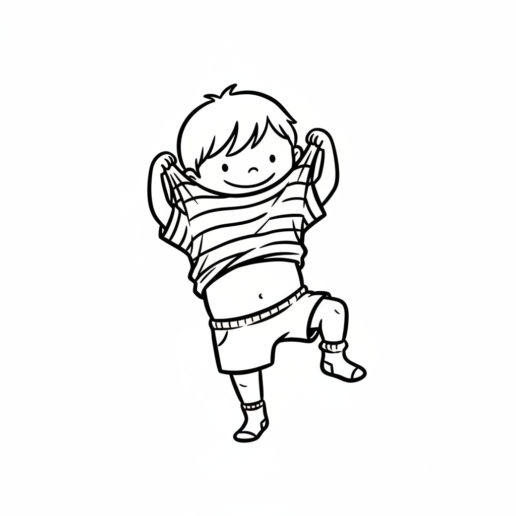 Ein fröhliches Kind zieht sich ein T-Shirt über den Kopf.