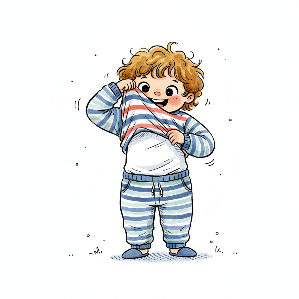 Niedliche, kindgerecht illustrierte Szene mit einem Kind oder einer Person als Hauptfigur, vor rein weißem Hintergrund, im frech-nordischen Aquarell-Skizzenstil. Klare, leicht wackelige Tuschekonturen, sichtbare Pinsel- und Strichtextur, dezente Schraffuren, weiche handgemalte Farbflächen in gedeckten Farben. Einfache, runde Formen. Keine harten Schatten, sondern sanfte, transparente Aquarellschichten. Leicht raue, handgezeichnete Linien statt glatter Vektorkanten. Subtile, vereinzelte Kritzelpunkte oder kleine Details im Hintergrund (wie Pünktchen oder feine Striche), aber keine echte Umgebung oder Landschaft. Die Figur ist mittig zentriert. Insgesamt charmant, humorvoll, warm und handgemacht wirkend. WICHTIG: Das Bild darf ABSOLUT KEINEN TEXT, KEINE BUCHSTABEN und KEINE ZAHLEN enthalten.