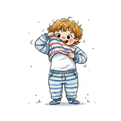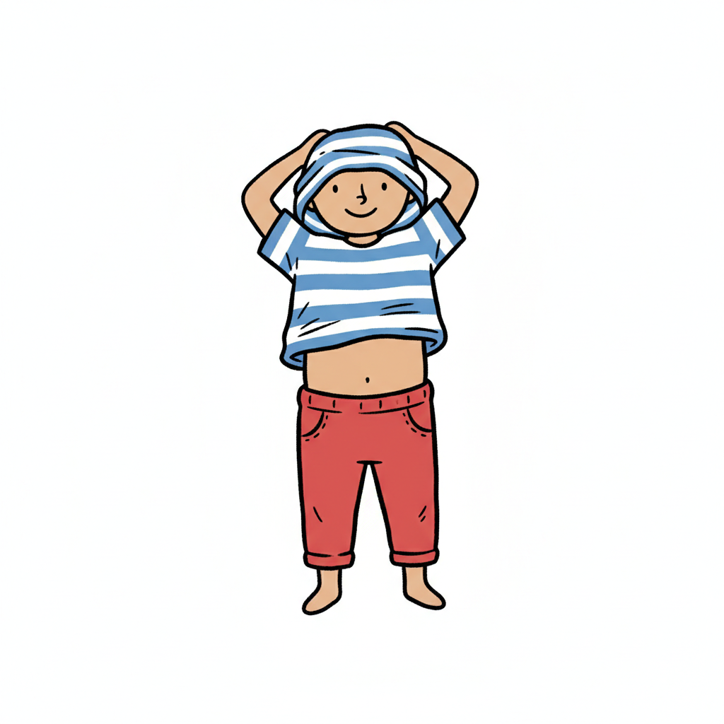 Ein fröhliches Kind zieht sich ein Oberteil an und lächelt.
