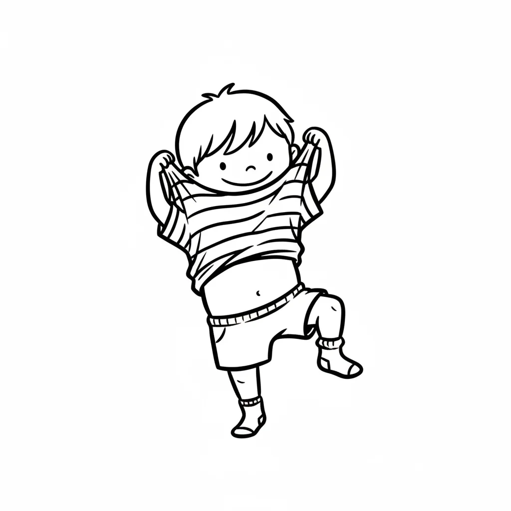 Ein fröhlicher Junge zieht sich ein T-Shirt über den Kopf.