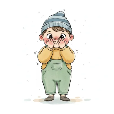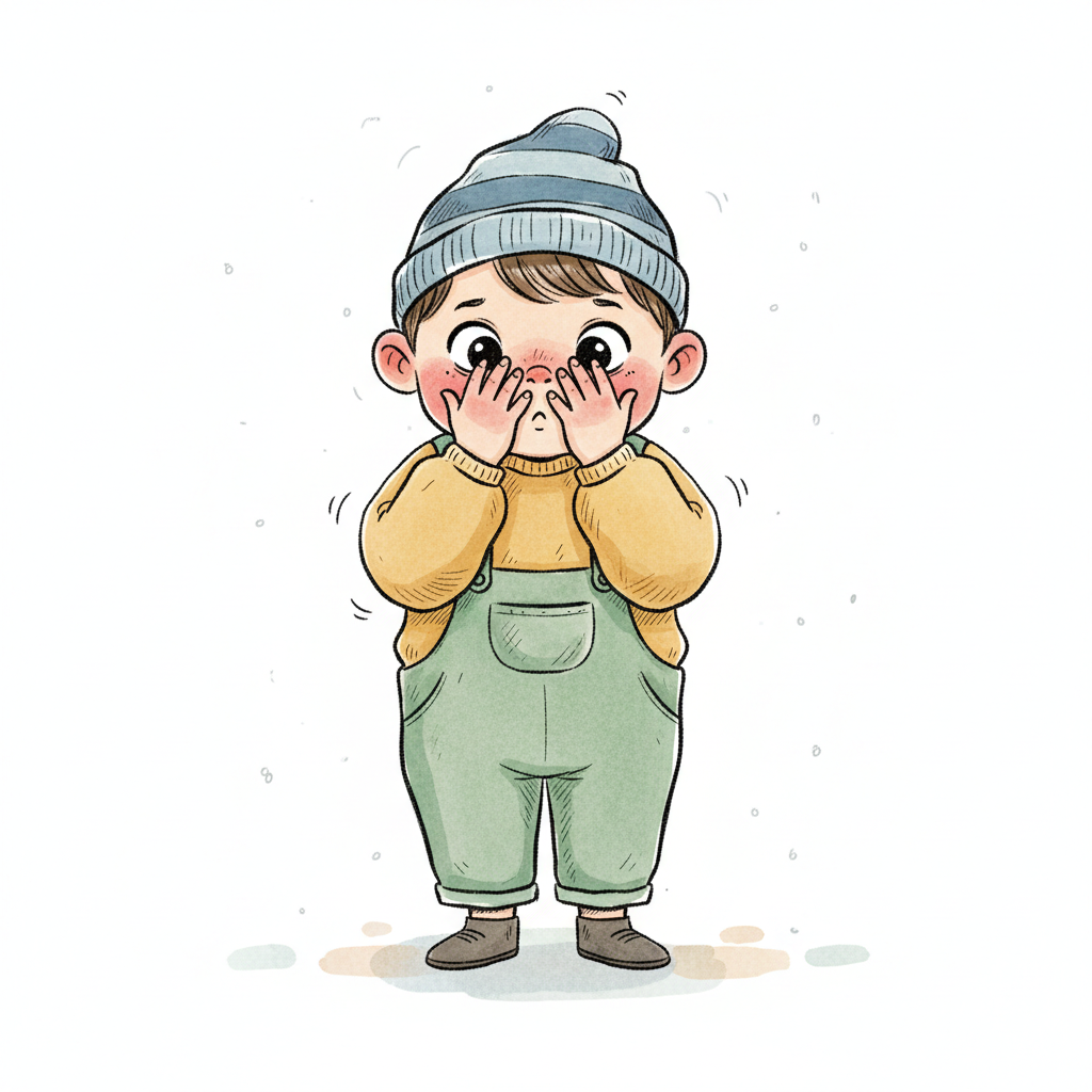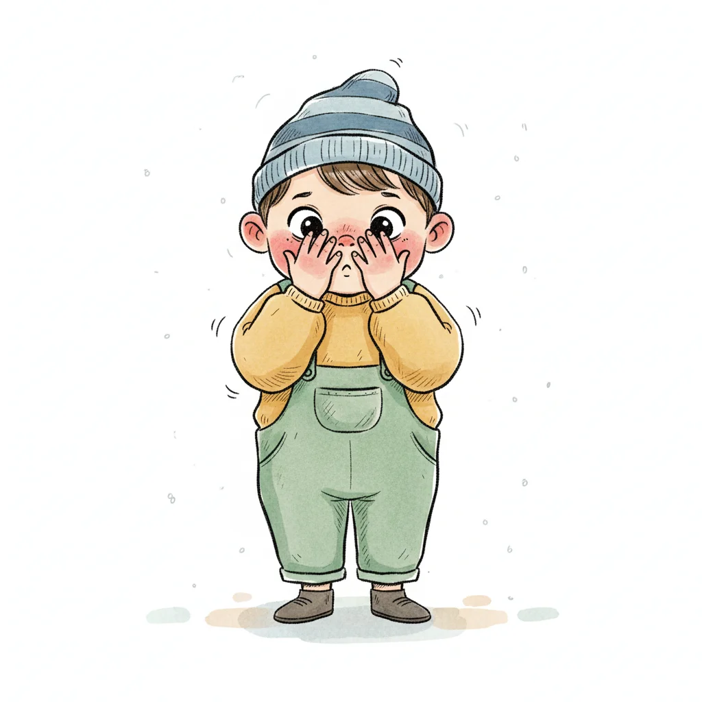 Ein Junge verdeckt sein Gesicht, wirkt schüchtern oder überrascht.
