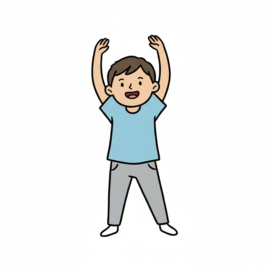 Ein fröhlicher Junge macht eine Dehnübung mit gestreckten Armen.