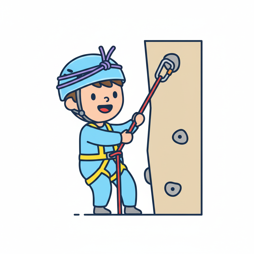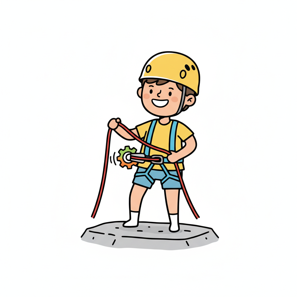 Fröhlicher Cartoon-Junge mit Helm und Klettergurt, der ein Seil und Sicherungsgerät bedient.
