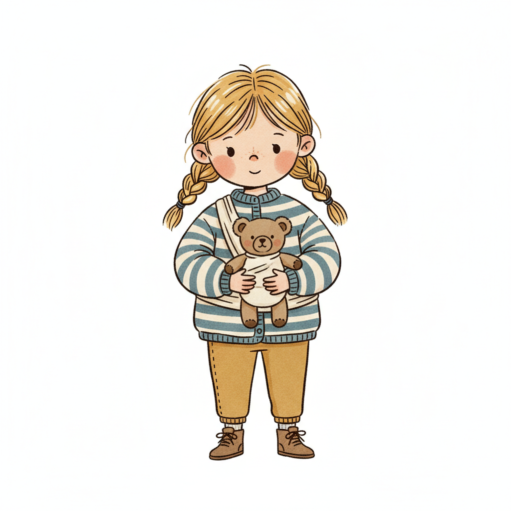 Niedliche, kindgerecht illustrierte Szene mit einem Kind oder einer Person als Hauptfigur, vor rein weißem Hintergrund, im frech-nordischen Aquarell-Skizzenstil. Klare, leicht wackelige Tuschekonturen, sichtbare Pinsel- und Strichtextur, dezente Schraffuren, weiche handgemalte Farbflächen in gedeckten Farben. Einfache, runde Formen. Keine harten Schatten, sondern sanfte, transparente Aquarellschichten. Leicht raue, handgezeichnete Linien statt glatter Vektorkanten. Subtile, vereinzelte Kritzelpunkte oder kleine Details im Hintergrund (wie Pünktchen oder feine Striche), aber keine echte Umgebung oder Landschaft. Die Figur ist mittig zentriert. Insgesamt charmant, humorvoll, warm und handgemacht wirkend. WICHTIG: Das Bild darf ABSOLUT KEINEN TEXT, KEINE BUCHSTABEN und KEINE ZAHLEN enthalten.