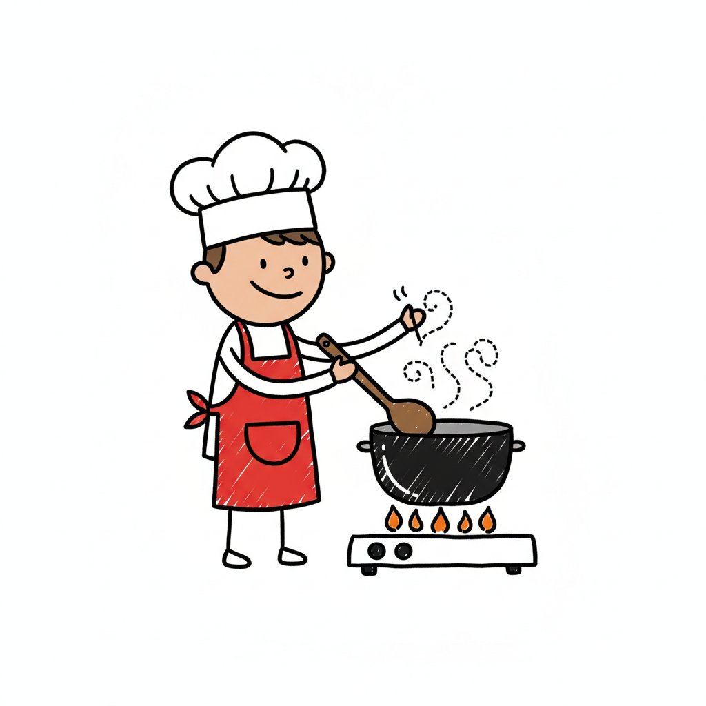 Ein lächelnder Cartoon-Koch rührt in einem Topf auf dem Herd. Dampf steigt auf.