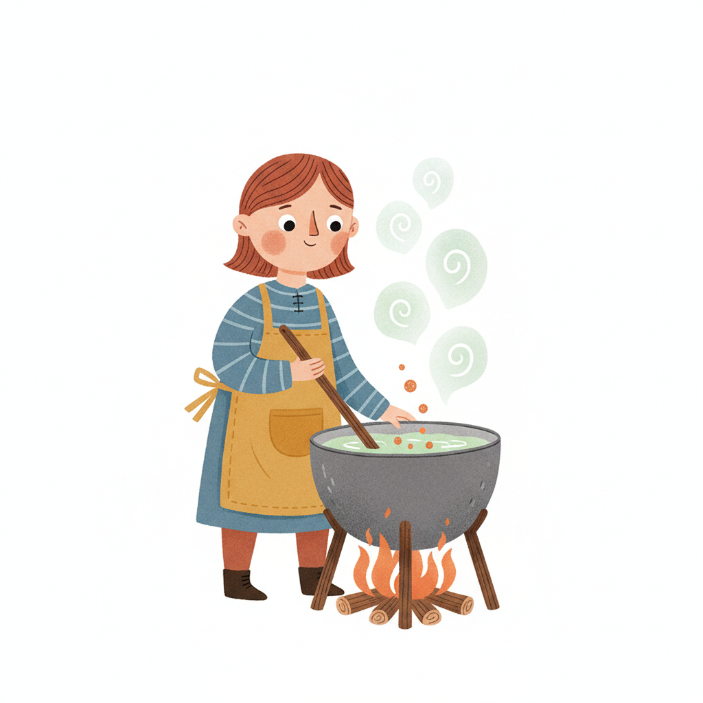 Cartoon-Mädchen rührt in einem Kessel über einem Lagerfeuer, Dampf steigt auf.