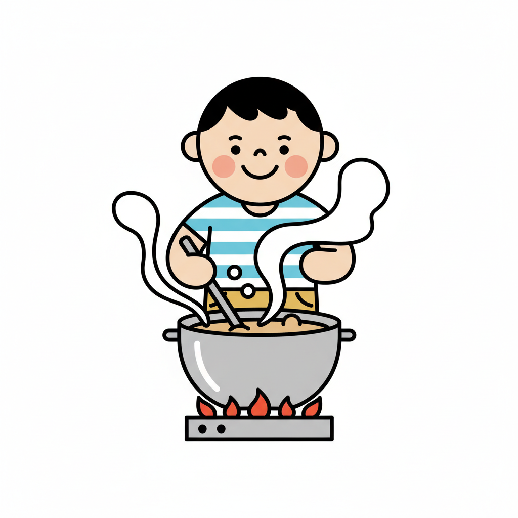 Ein lächelnder Cartoon-Junge kocht in einem Topf auf dem Herd, Dampf steigt auf.