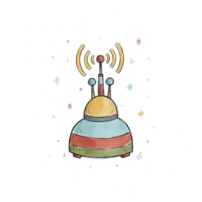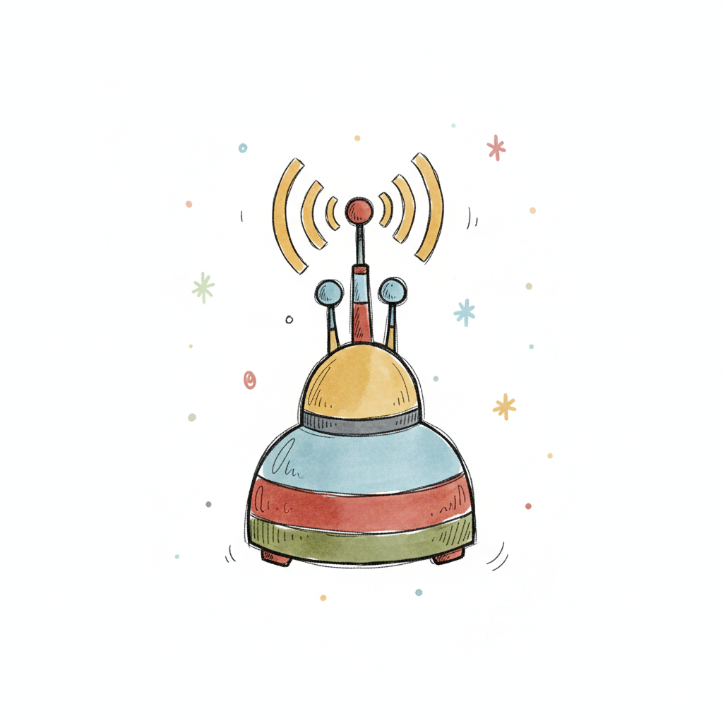 Buntes, cartoonartiges Gerät mit Antenne, die Funksignale aussendet, umgeben von kleinen Sternen.