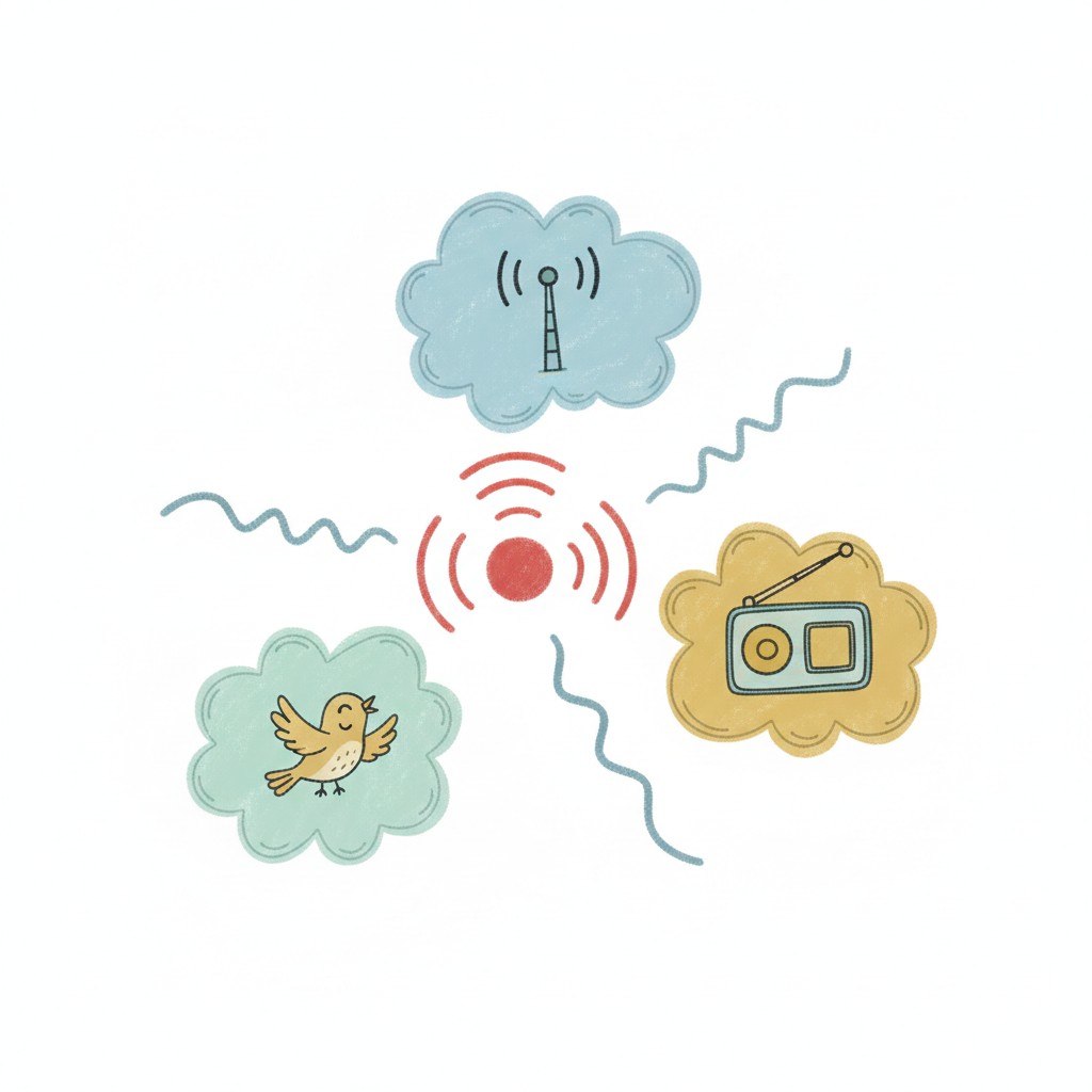 Zentrales Signal breitet sich zu Funkturm, Vogel und Radio aus, symbolisiert verschiedene Kommunikationswege.