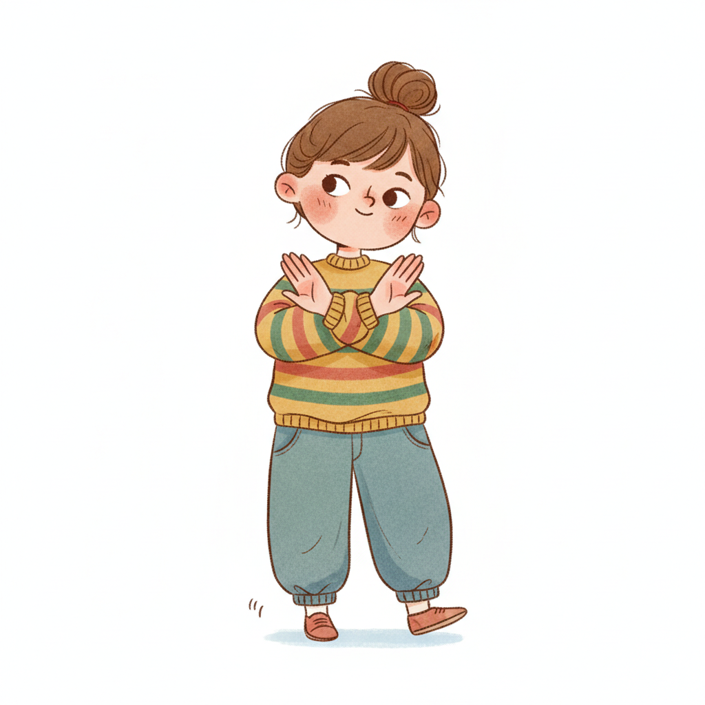 Niedliches Cartoon-Mädchen mit Dutt und gestreiftem Pullover, das mit gekreuzten Armen 'Stopp' signalisiert.