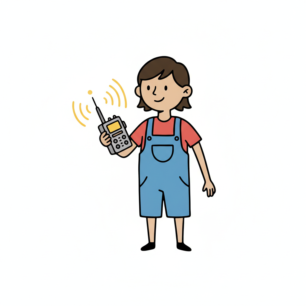 Ein lächelndes Cartoon-Kind in Latzhose hält ein Walkie-Talkie mit Sendesignal.