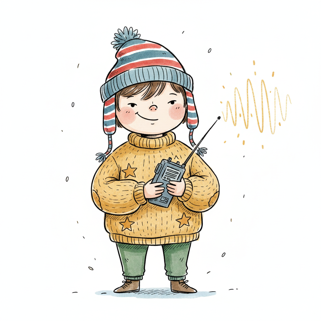 Ein lächelndes Kind in Winterkleidung hält ein Walkie-Talkie, das ein Signal aussendet.