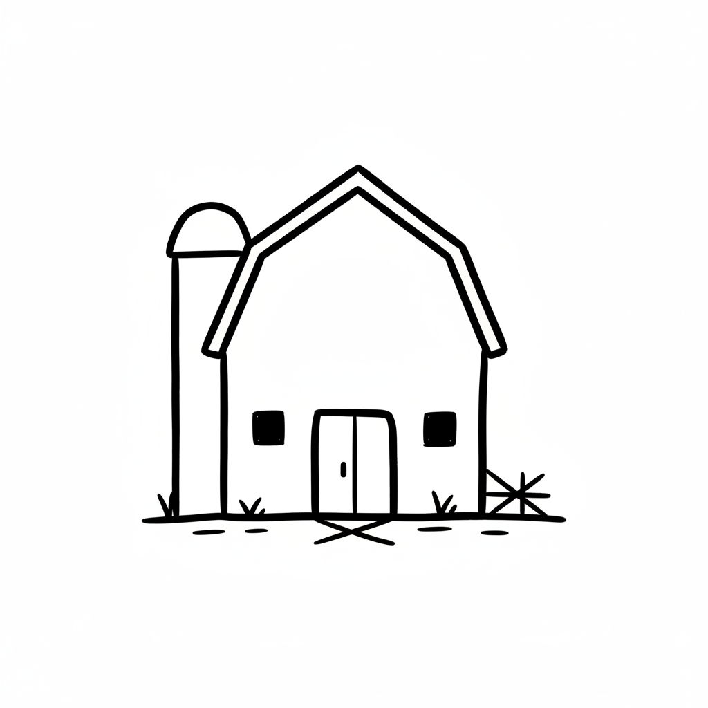 Eine einfache, handgezeichnete Schwarz-Weiß-Illustration einer Scheune mit Silo und etwas Gras.