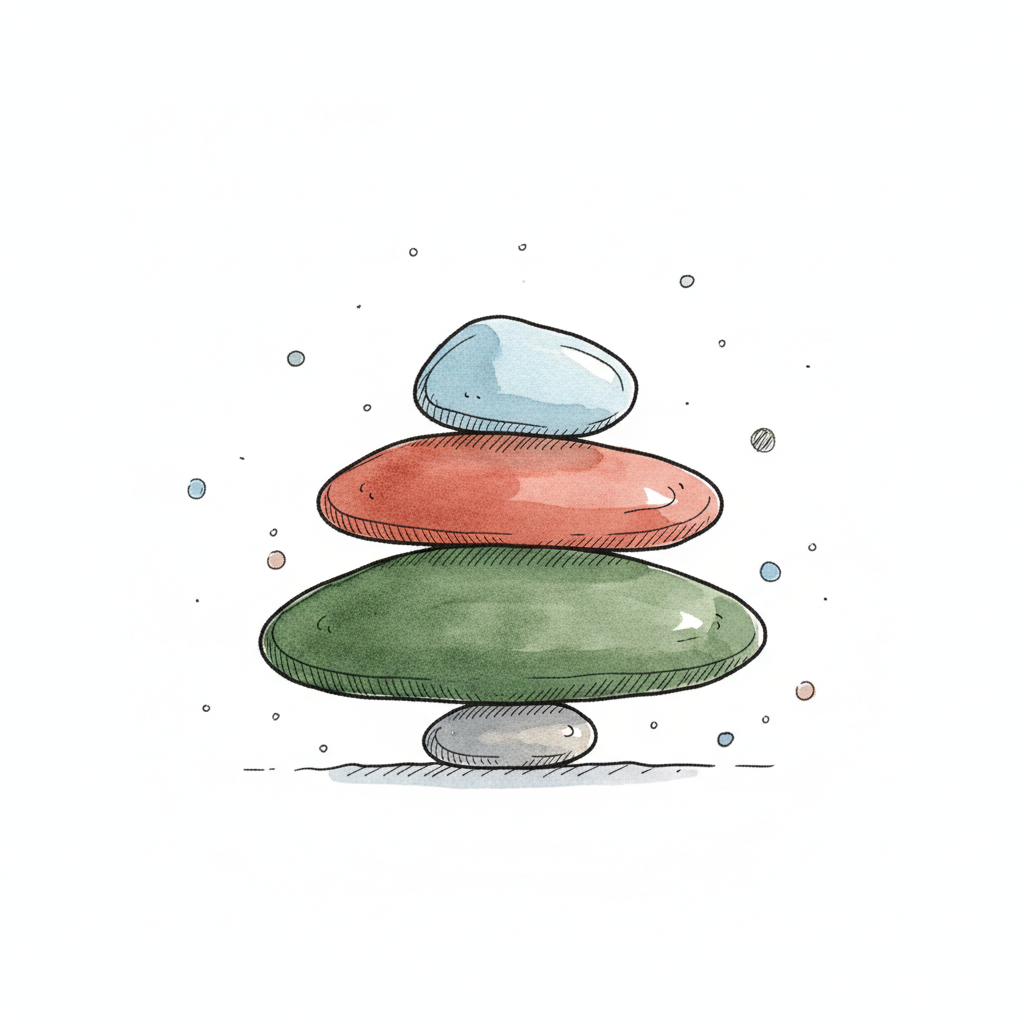Aquarell-Illustration von vier farbigen, gestapelten Steinen, die Balance symbolisieren.