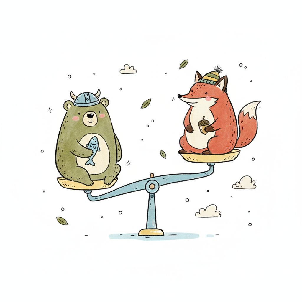 Ein Bär mit Fisch und ein Fuchs mit Eichel sitzen auf einer ausgeglichenen Waage.