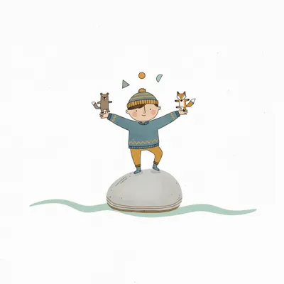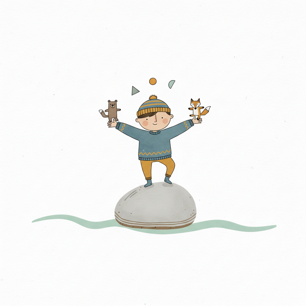 Ein Junge in Winterkleidung balanciert auf einem Stein, hält Bär und Fuchs, mit schwebenden Formen.