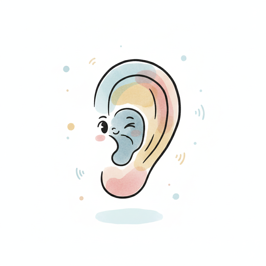 Niedliche Aquarell-Illustration eines Ohres mit Gesicht, das zwinkert und lauscht.