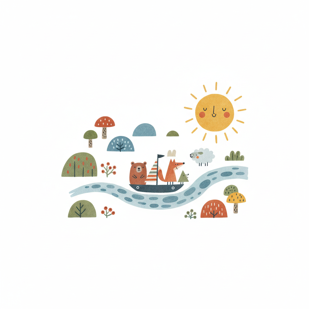 Bär und Fuchs fahren Boot auf Fluss, umgeben von Natur, Schaf und lachender Sonne.