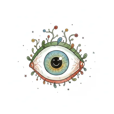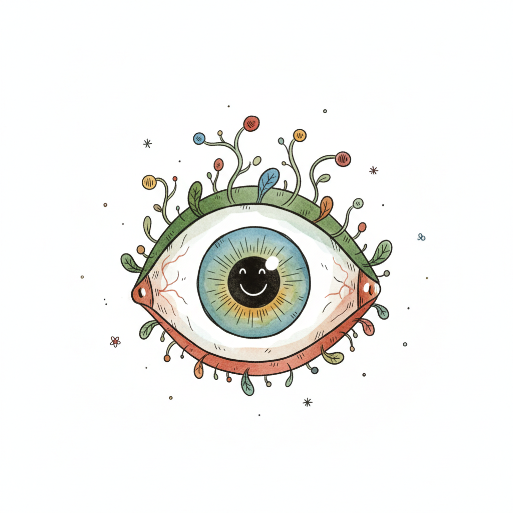 Buntes, illustriertes Auge mit Pflanzenbewuchs und einem lächelnden Pupillen-Gesicht.