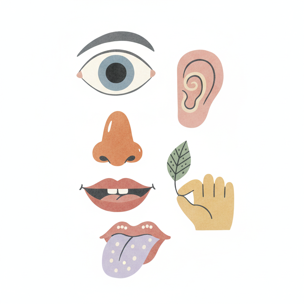 Bunte Illustration der fünf Sinne: Auge, Ohr, Nase, Mund, Zunge und Hand mit Blatt.