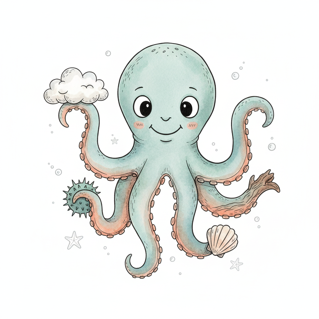 Niedlicher, lächelnder Oktopus hält Wolke, Seeigel und Muschel in seinen Tentakeln, umgeben von Blasen.