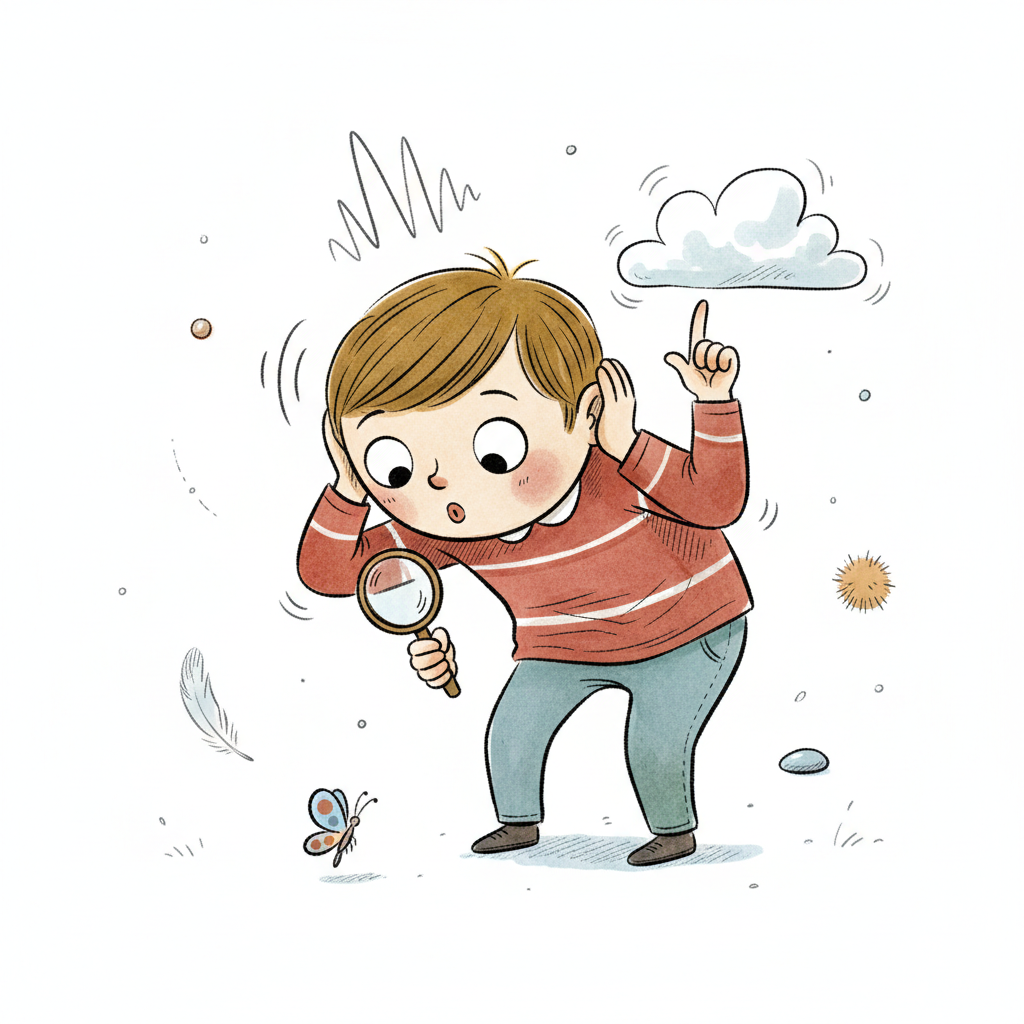 Kind beobachtet Schmetterling mit Lupe, lauscht und entdeckt die Welt mit allen Sinnen.