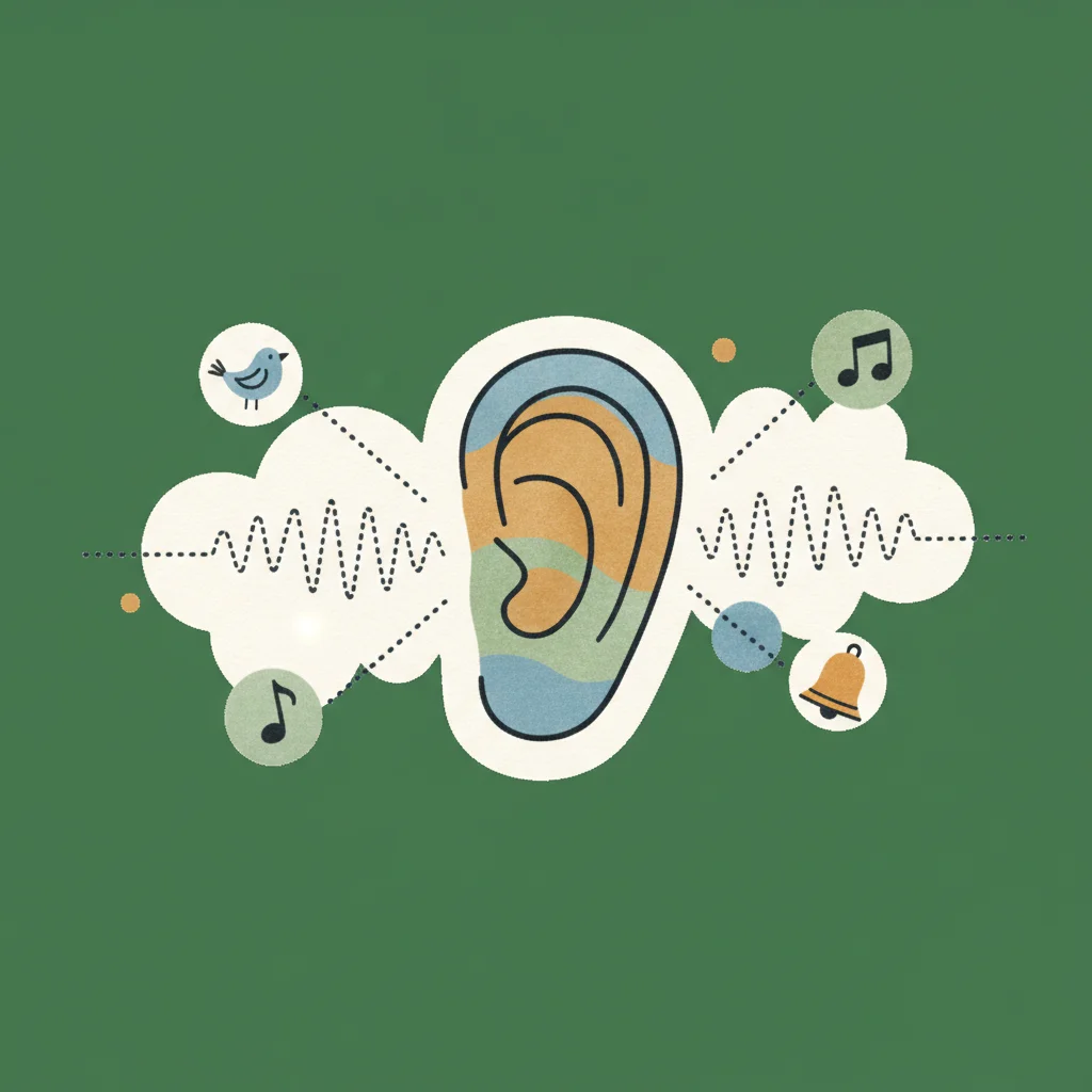 Abstrakte Darstellung des Hörens mit einem Ohr, Schallwellen und Geräuschsymbolen wie Vogel, Musik, Glocke.