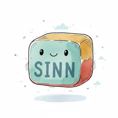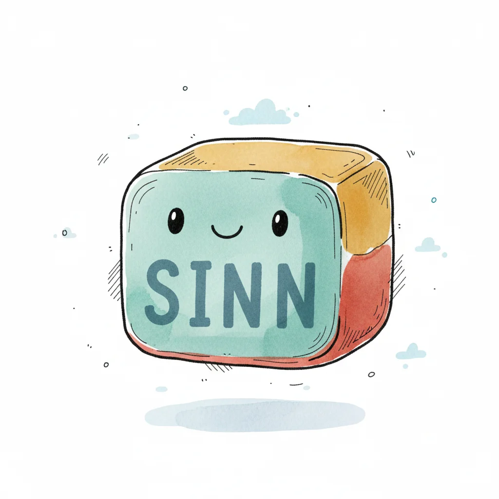 Niedlicher, lächelnder Würfel mit 'SINN' Aufschrift im Aquarell-Stil, schwebend.