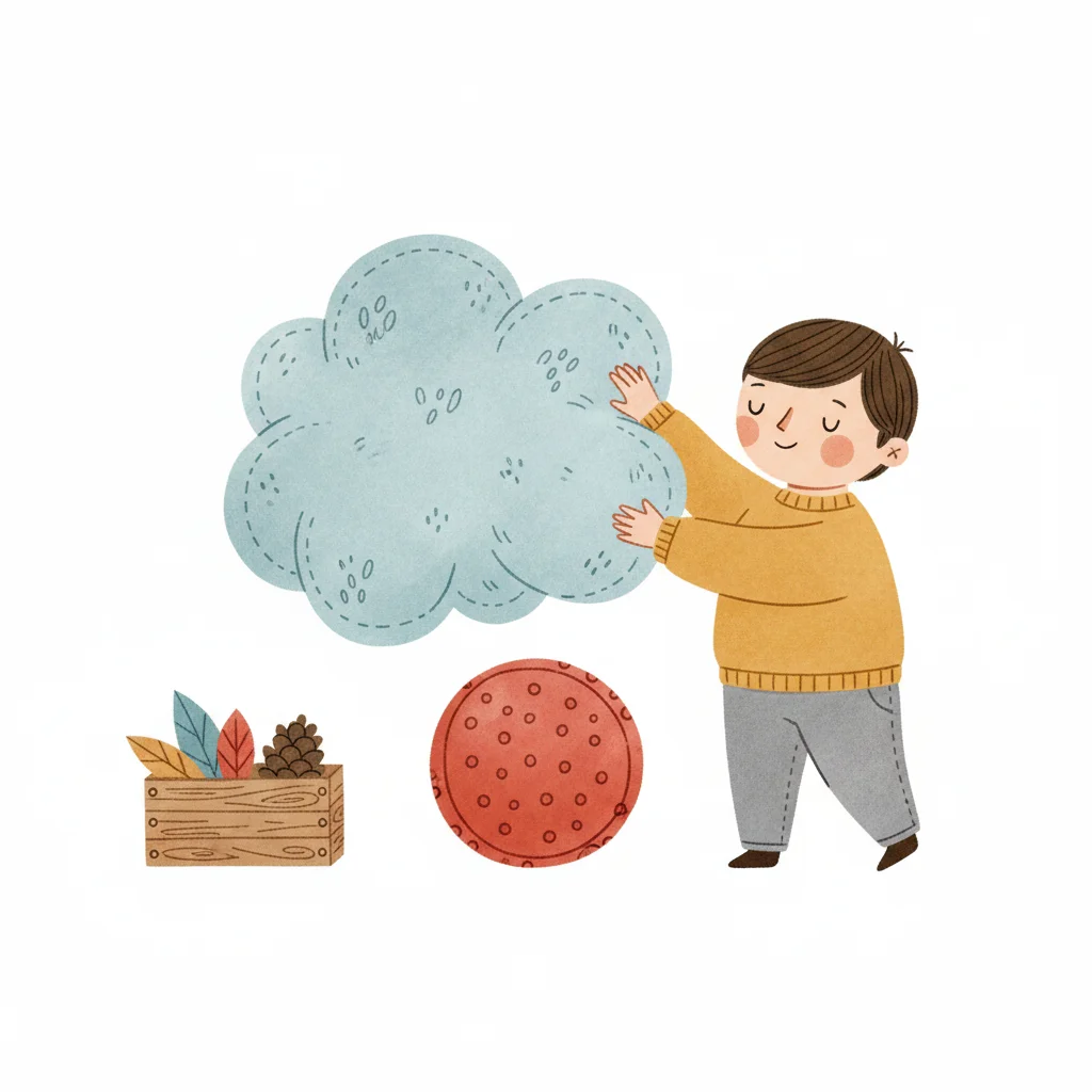 Ein Junge umarmt eine Wolke, daneben eine Kiste mit Herbstblättern und ein roter Ball.