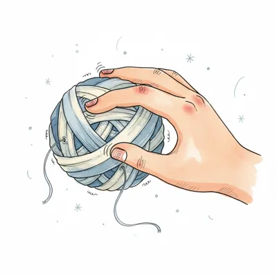 Eine illustrierte Hand hält einen blau-weiß gestreiften Garnknäuel.