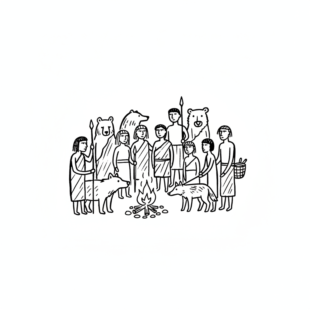 Strichzeichnung von Menschen, Bären und Wölfen um ein Lagerfeuer, prähistorische Szene.