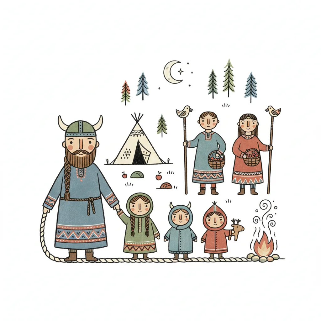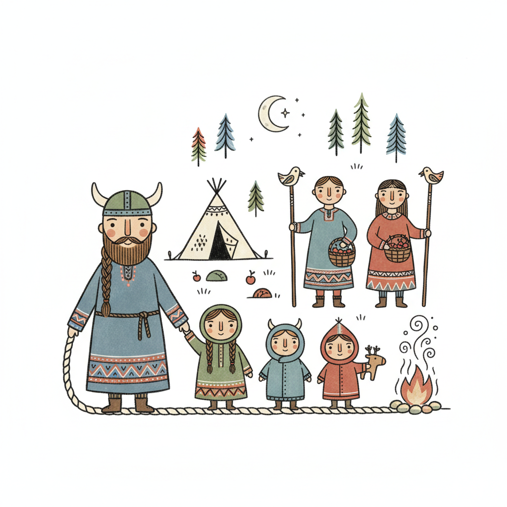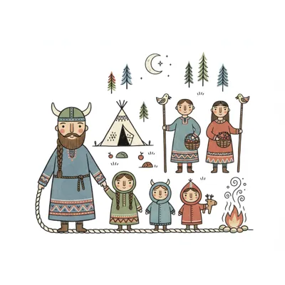 Niedliche Illustration einer nordischen Familie mit Wikinger, Kindern, Zelt und Lagerfeuer.