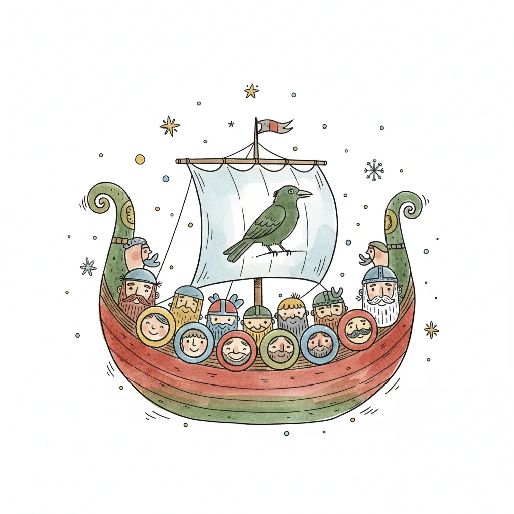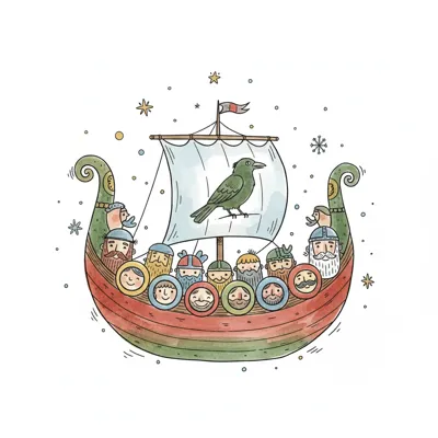 Buntes Wikingerschiff mit Wikingern und einem Raben auf dem Segel, umgeben von Sternen.