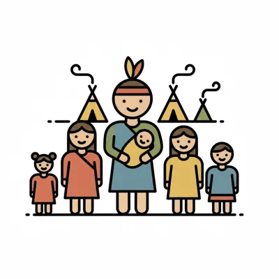 Buntes Icon einer indigenen Familie mit Mutter, Baby und vier Kindern vor Wigwams.