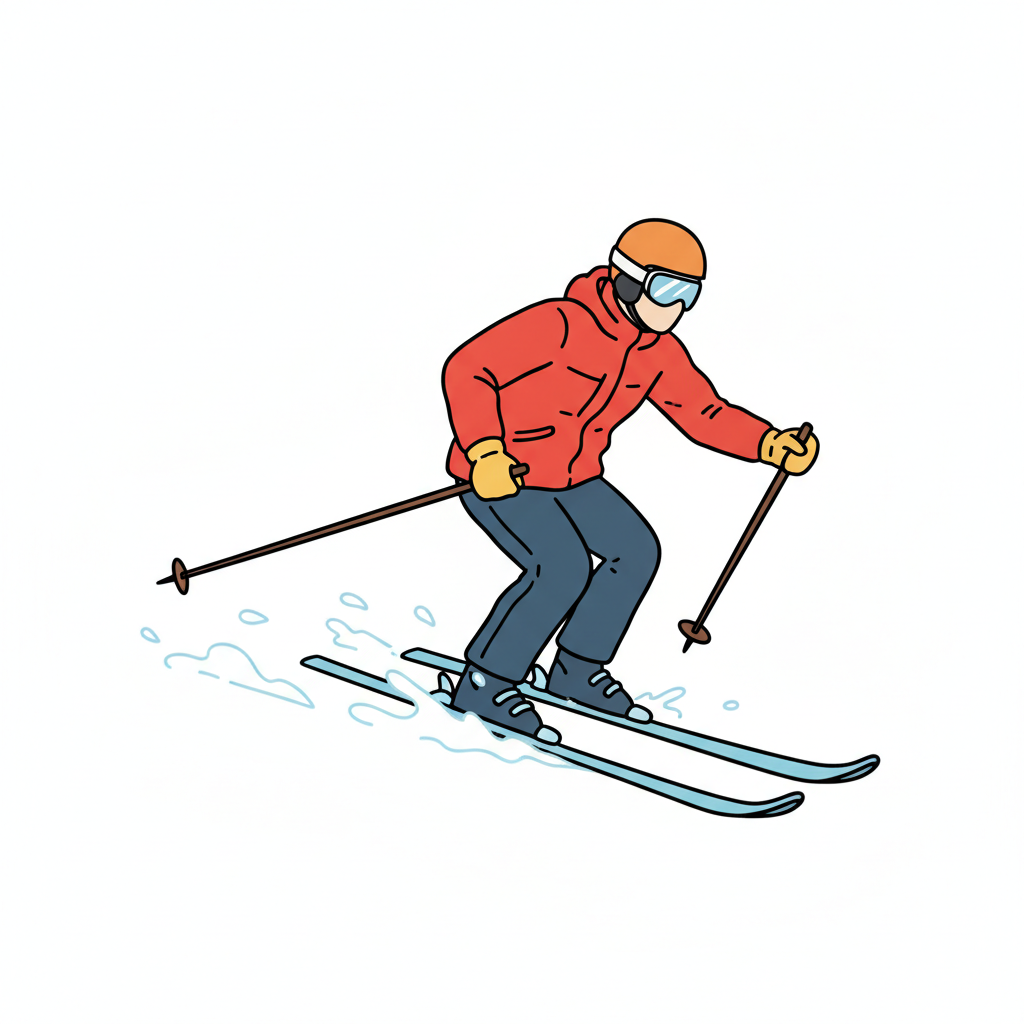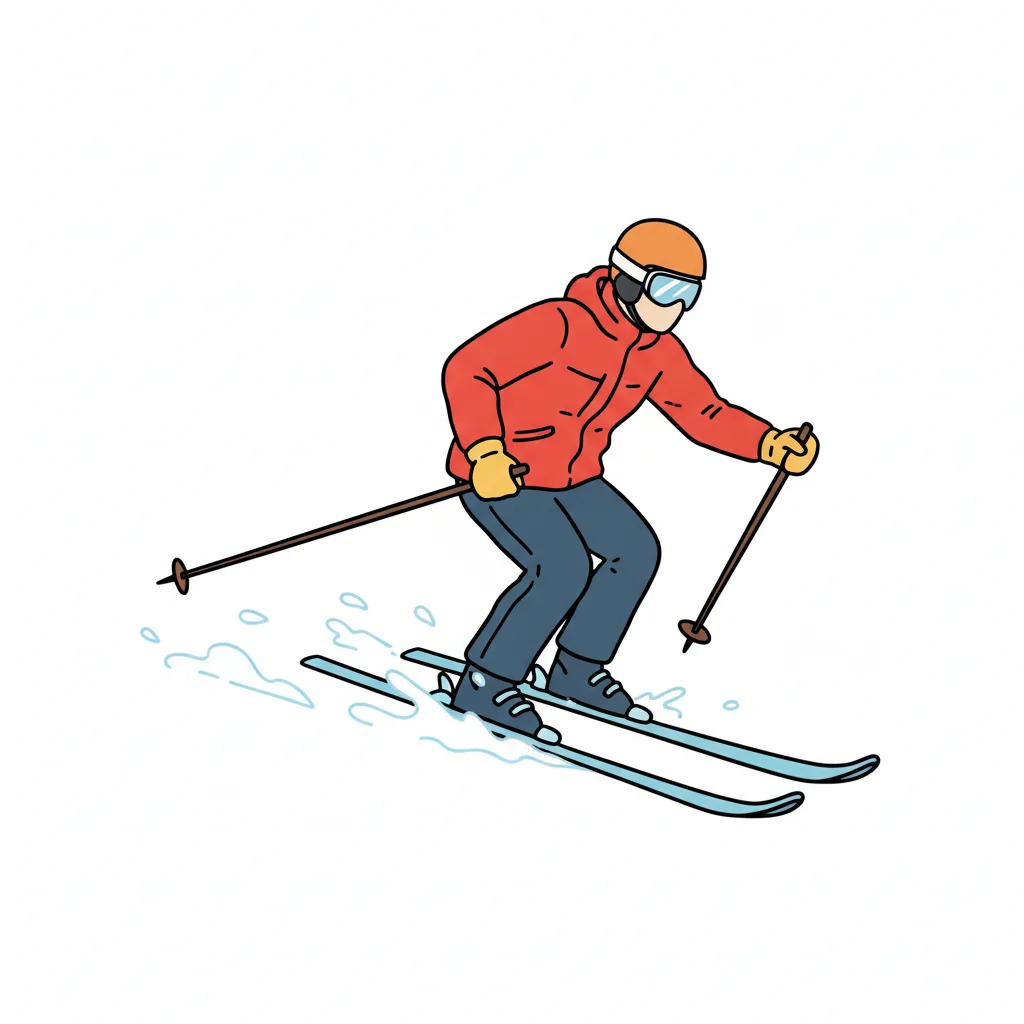 Cartoon-Illustration eines Skifahrers in roter Jacke und Helm, der mit Skistöcken fährt.
