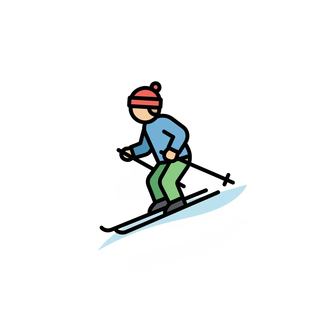 Stilisierte Darstellung eines Skifahrers mit roter Mütze, blauer Jacke und grüner Hose auf Skiern.