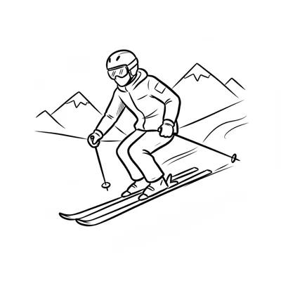 Schwarz-weiß-Illustration eines Skifahrers mit Helm und Brille, der einen Hang hinunterfährt, mit Bergen im Hintergrund.