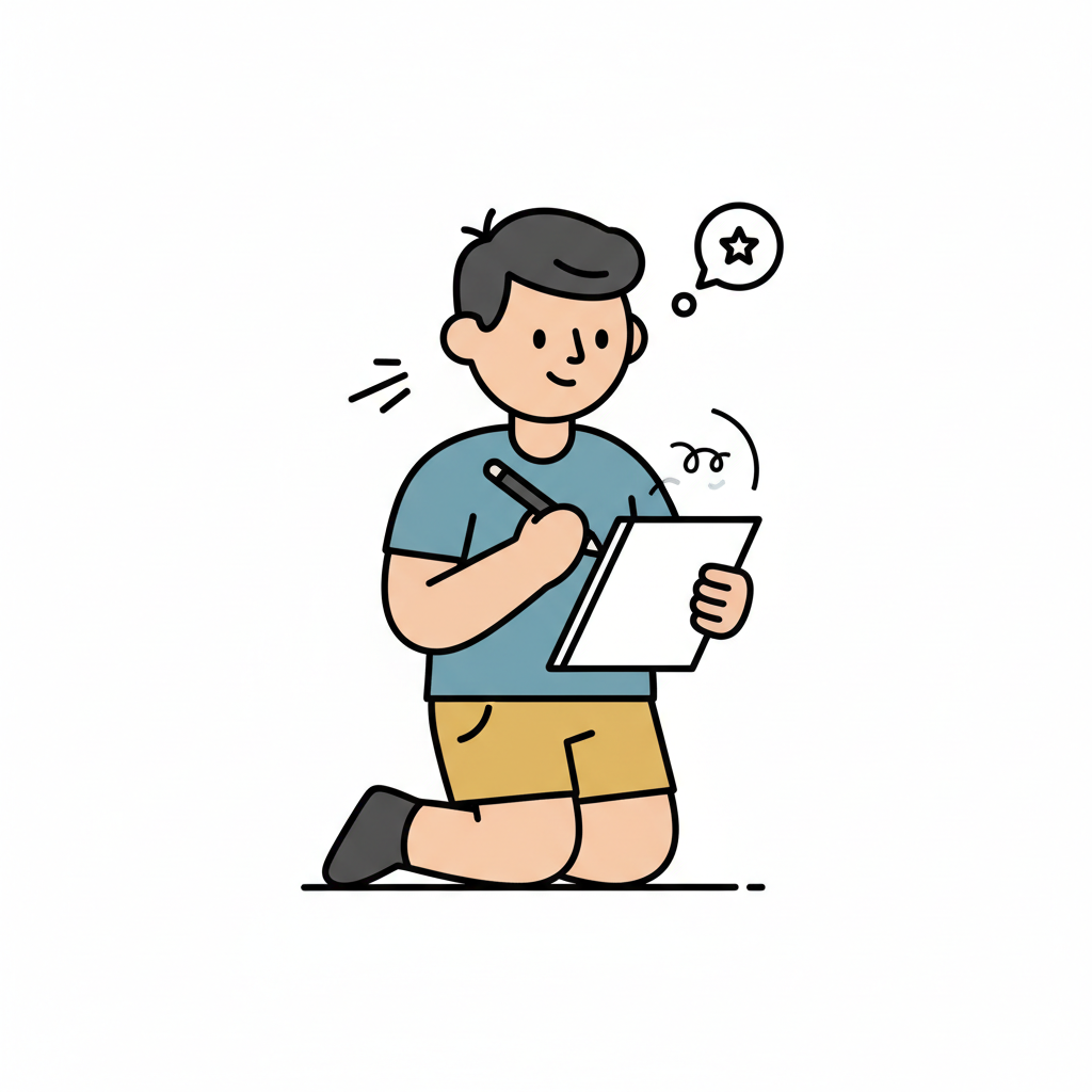 Ein Cartoon-Junge kniet und zeichnet auf einem Tablet, mit einer Stern-Idee im Kopf.
