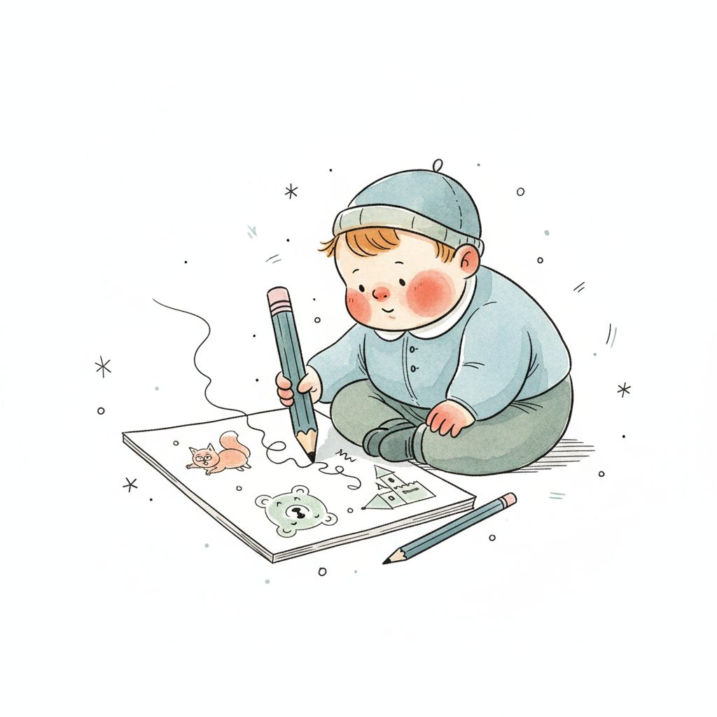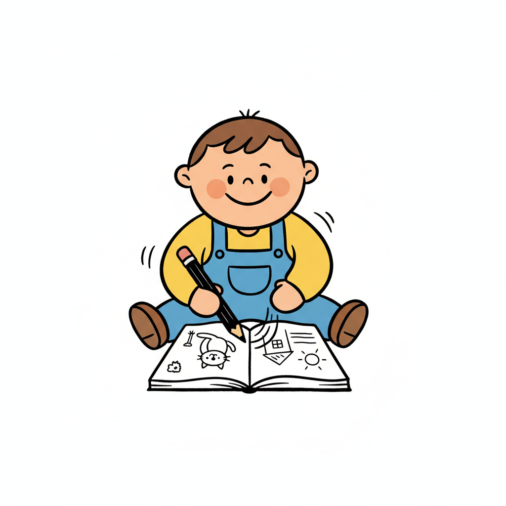 Ein lächelndes Baby in Latzhose zeichnet mit einem Bleistift in einem Buch, das eine Katze, ein Haus und die Sonne zeigt.