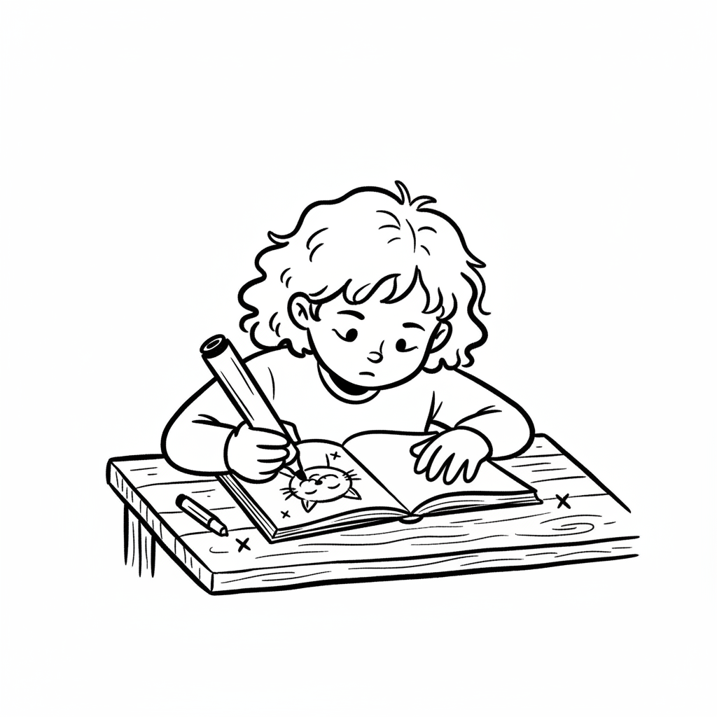 Schwarz-weiß-Illustration eines Kindes, das konzentriert ein Kätzchen in ein Notizbuch zeichnet.