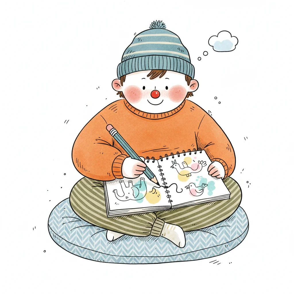 Ein lächelndes Kind mit Mütze sitzt und zeichnet bunte Tiere in ein Skizzenbuch.