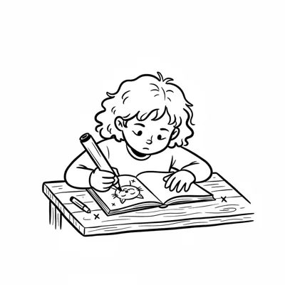 Ein Junge sitzt und zeichnet mit Bleistift in ein Skizzenbuch; Sonne, Bäume und ein Haus sind zu sehen.