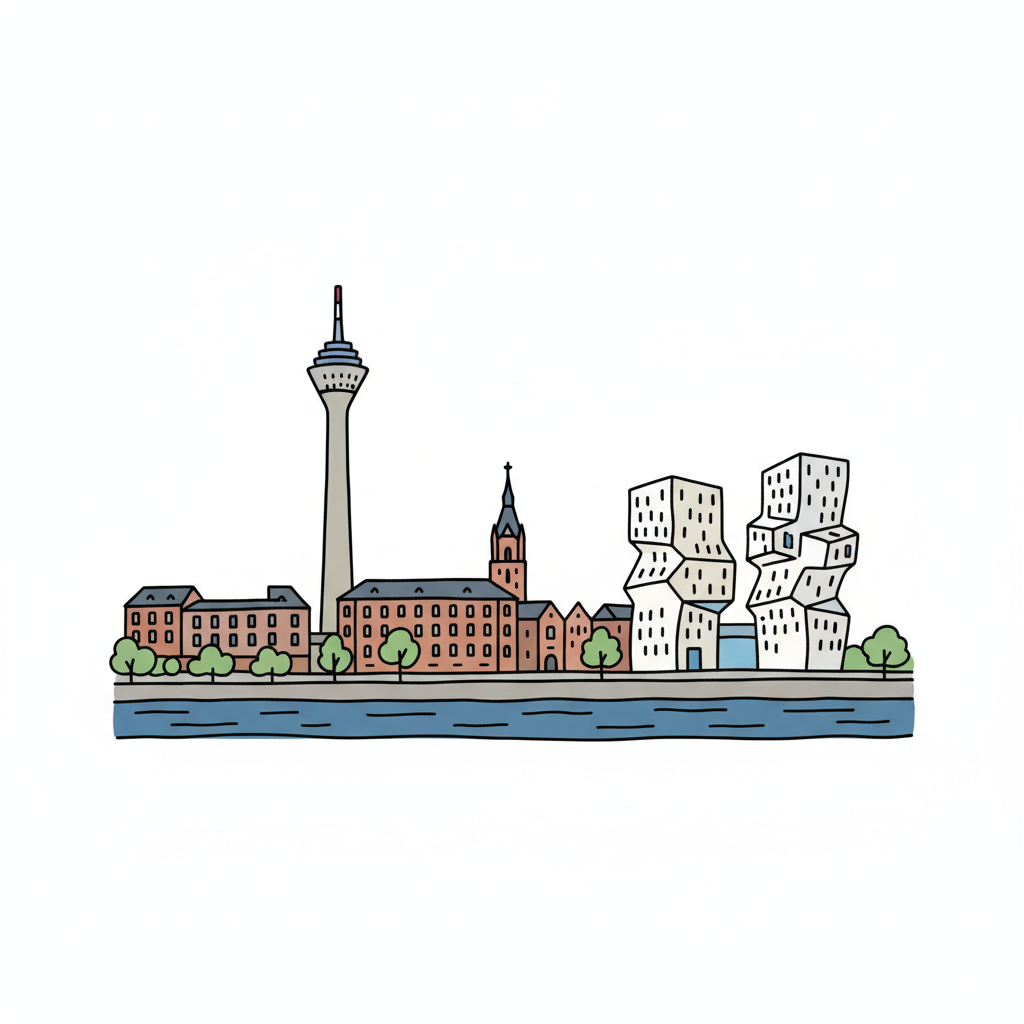 Stilisierte Skyline von Düsseldorf mit Rheinturm, Kirche und Gehry-Bauten am Flussufer.