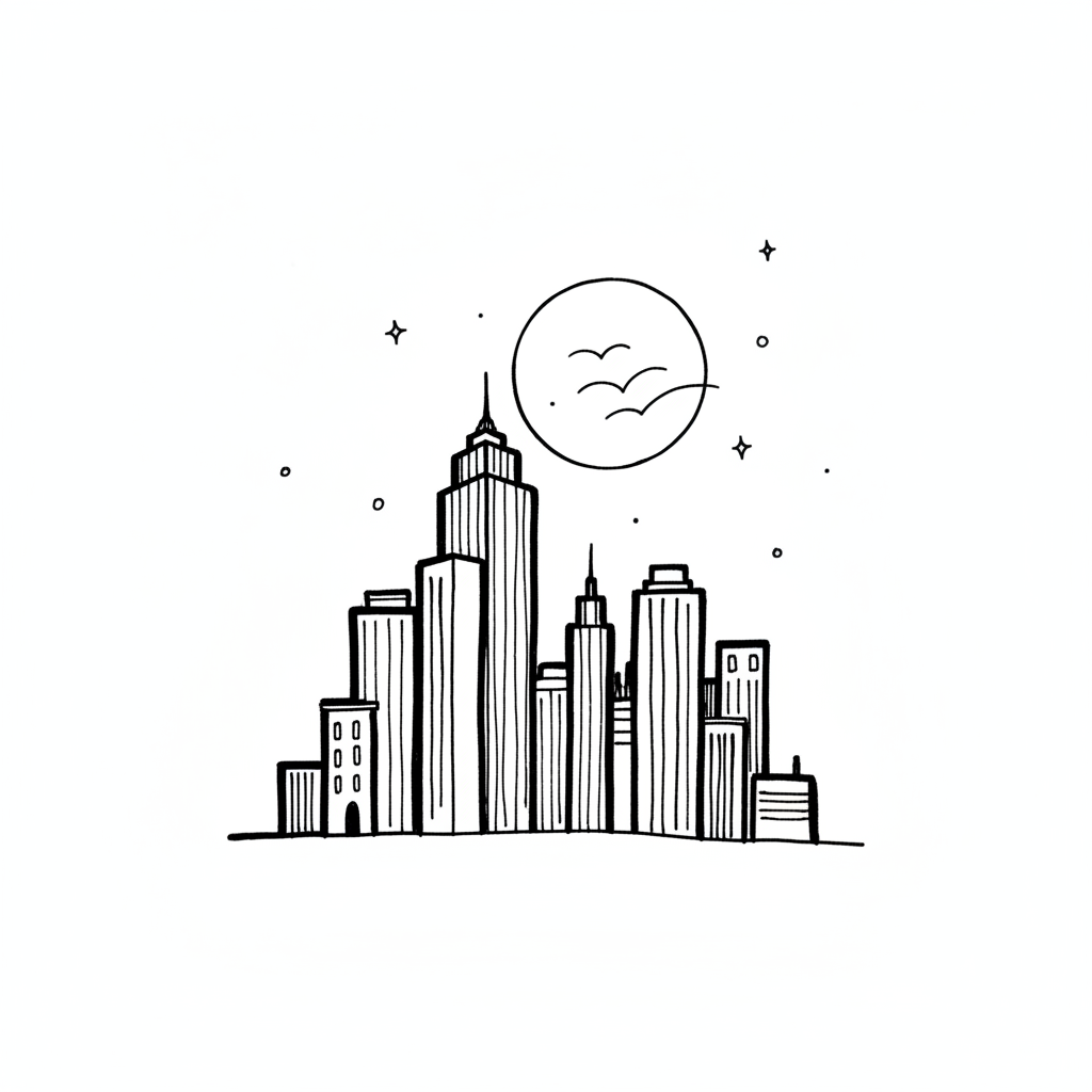 Handgezeichnete Stadtsilhouette bei Nacht mit Mond, Vögeln und Sternen.