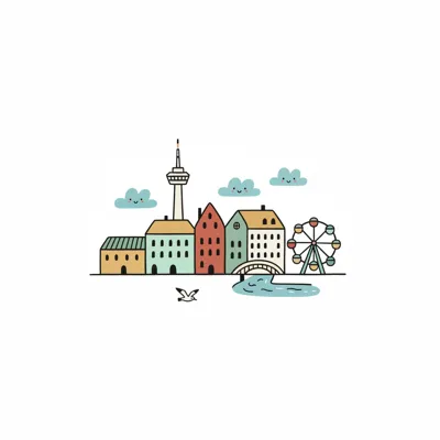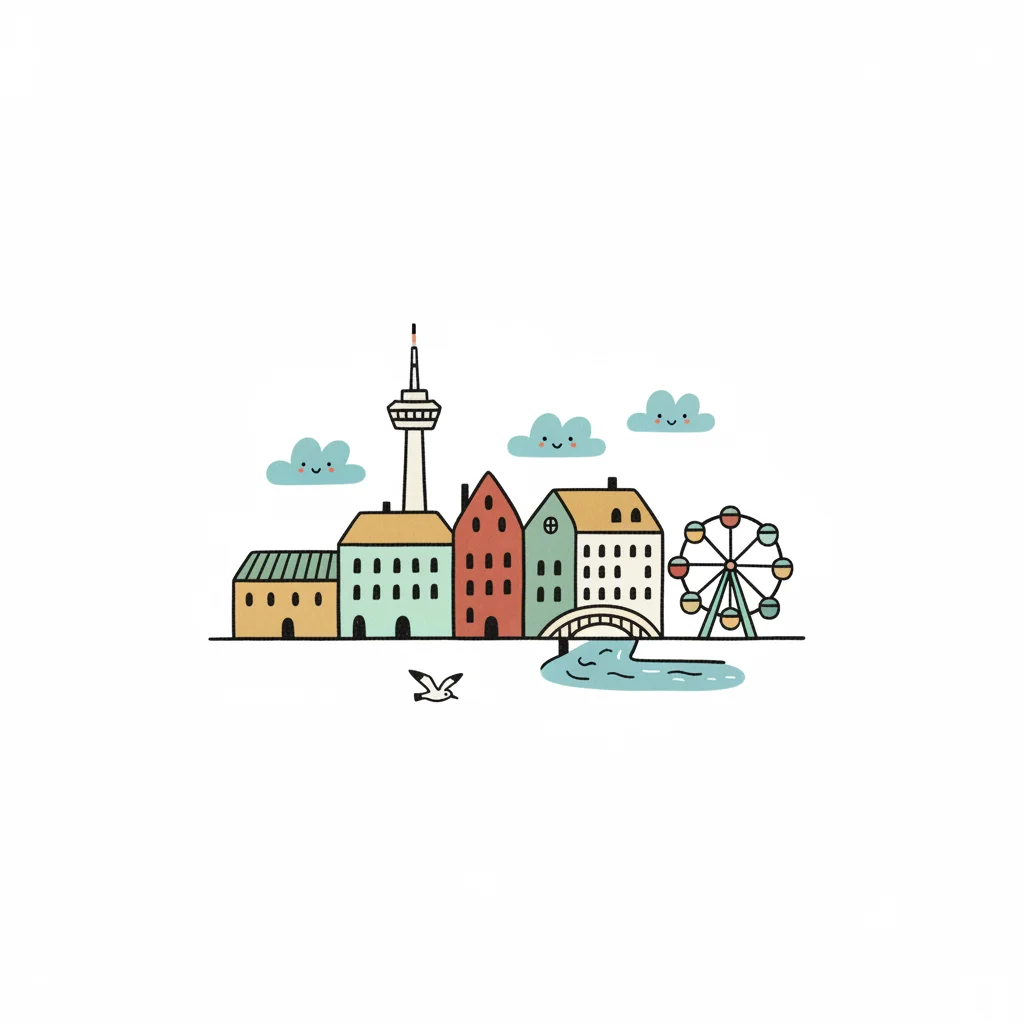 Niedliche Cartoon-Illustration einer Stadt mit bunten Häusern, Fernsehturm, Riesenrad, Fluss und lächelnden Wolken.