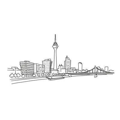 Strichzeichnung der Skyline von Düsseldorf mit Rheinturm, Gebäuden, Fluss und Brücke.