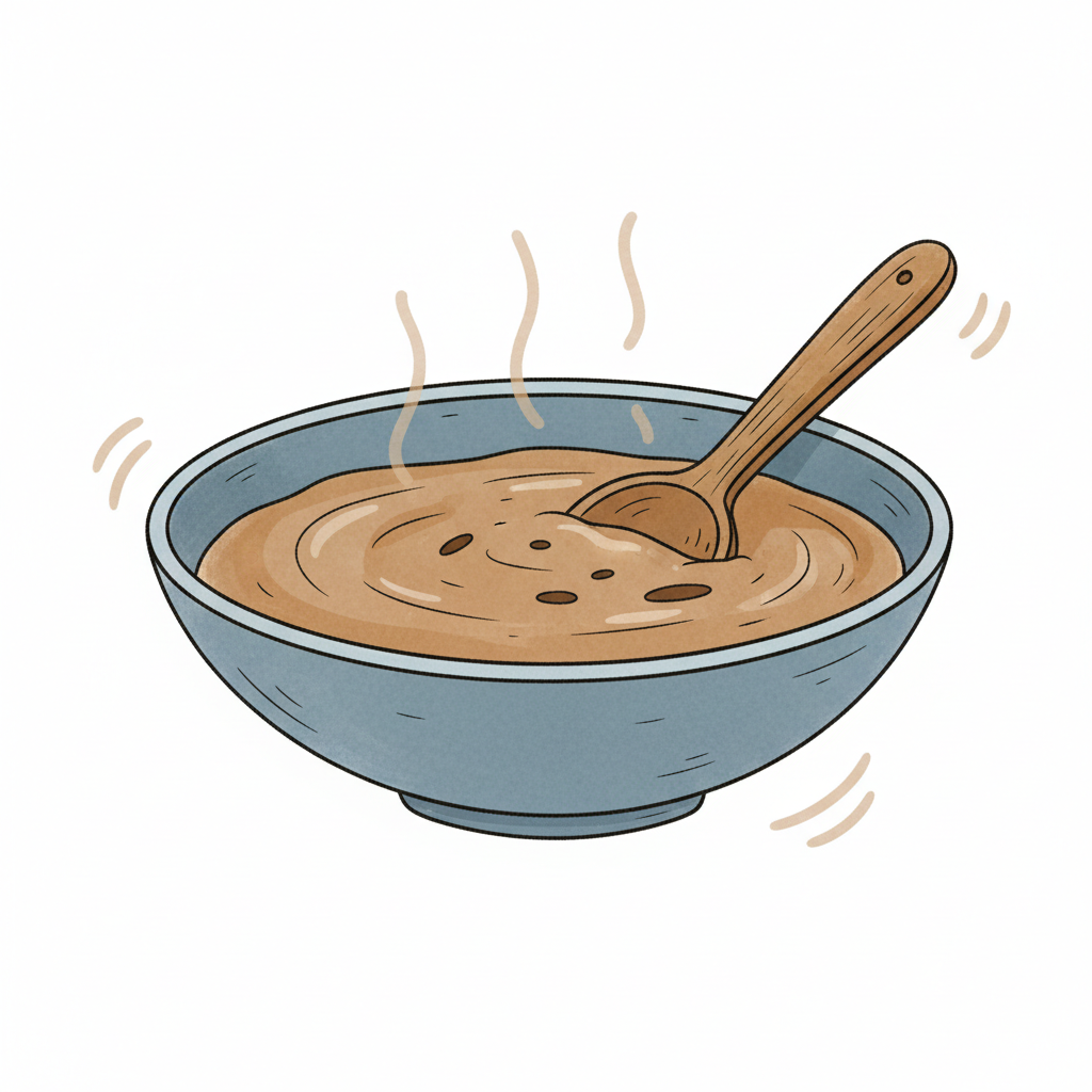 Eine dampfende Schüssel mit braunem Brei oder Suppe und einem Holzlöffel.
