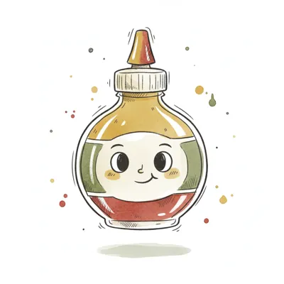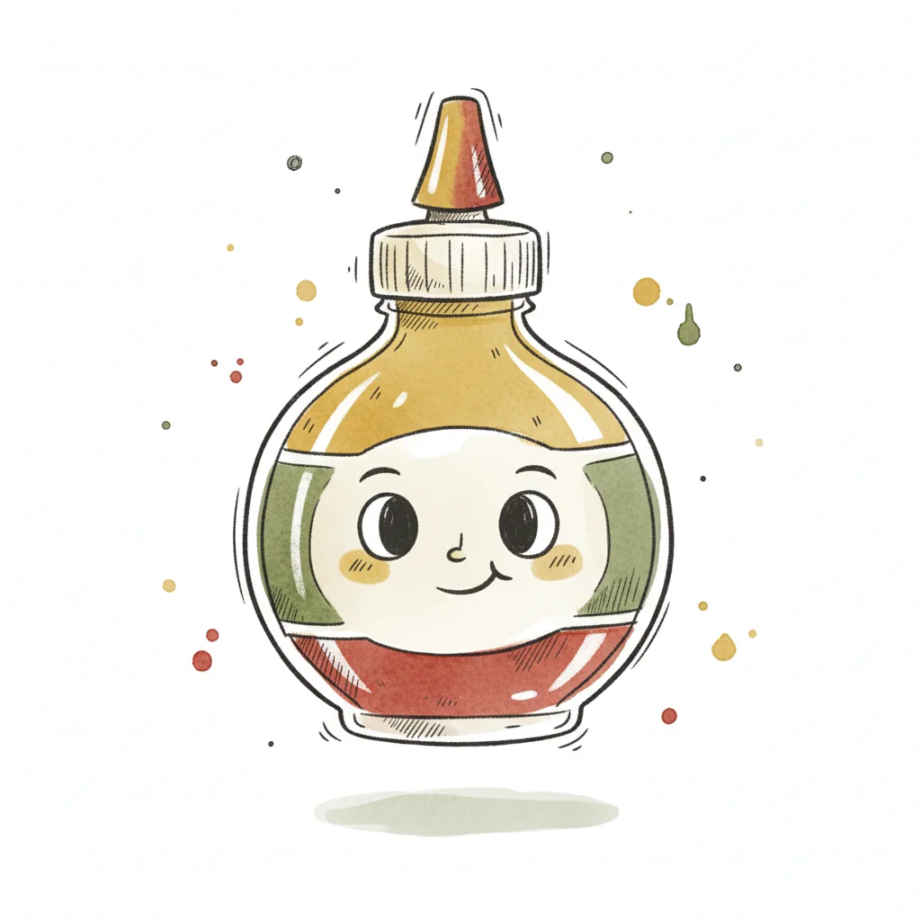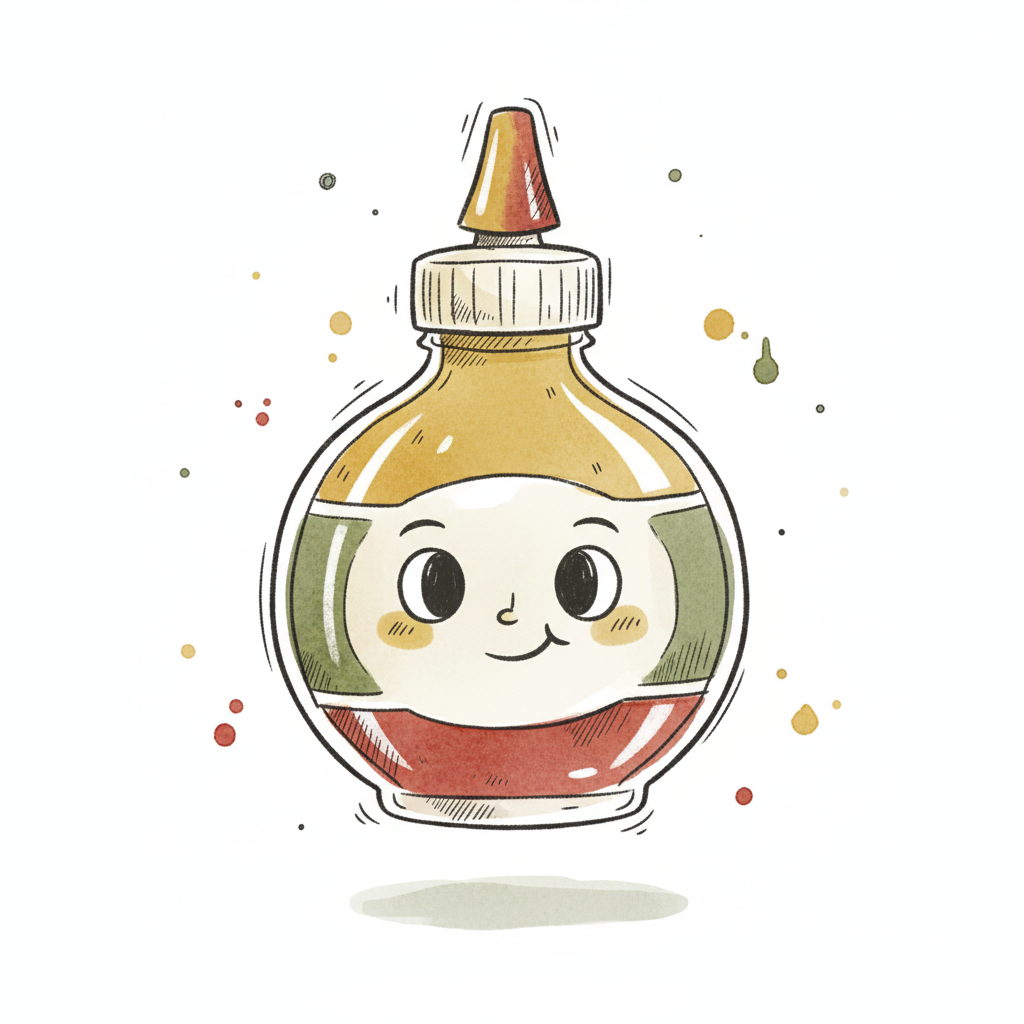 Niedliche Cartoon-Saucenflasche mit Gesicht, gefüllt mit gelber und roter Flüssigkeit.